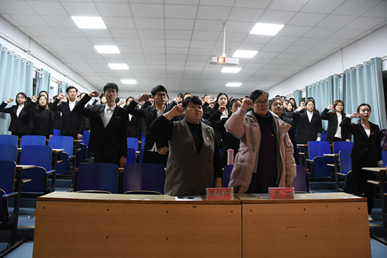 宣誓仪式在庄严的《国际歌》中拉开序幕,王瑾宣读预备党员名单,随后在正式党员袁千然的领誓下,68名预备党员进行集体宣誓,将对党的忠诚和入党的决心融入到掷地有声的宣誓中。宣誓结束,张铭作为新党员代表发言,她在发言中表示将不断提高自己的思想政治修养,树立起终生学习的观念,秉持为人民服务的宗旨,充分发挥带头作用,为社会主义建设贡献自己的一份力量。吴伟伟和王瑾为预备党员代表佩戴党徽,吴伟伟最后强调,预备党员应当牢记党员的责任和义务,认真学习党的方针政策,提高政治素质和政治敏锐性,以一个党员的标准严格要求自己,充分发挥党员先锋模范作用,为实现中华民族伟大复兴努力奋斗。