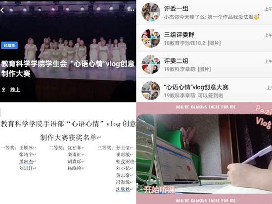 活动前期,手语部全体成员在工作群内制定活动规则并明确具体注意事项,同时进行任务分配,以保证活动有效地进行。同学们积极通过到梦空间报名参加,报名成功后根据下发的通知进入QQ群,活动负责人在群里向参赛选手讲述比赛要求,随后同学们将自己的vlog作品分享到群里。本次活动要求参赛选手们与大家分享居家生活与学习感受、困惑以及制作vlog的想法,同学们向大家介绍自己多彩的生活,包括己在家的学习状态,按课表听网课、认真地做笔记;课余时间坚持锻炼身体,以保持良好的身体状态和精神状态、做手账记录生活、与朋友一起出门散步出门等;向大家展示因为疫情而学会的一些技能等等。这次活动也给同学们提供了一次与他人分享自己的生活的机会,以其独有的魅力去感染他人、影响他人,同时还掌握了一项新的技能。