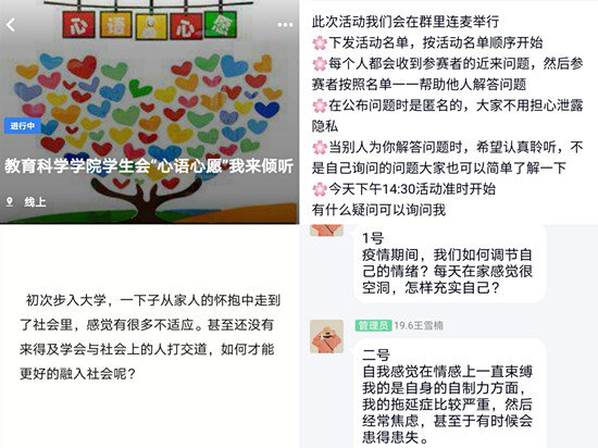 本次活动共分为“心语”和“心愿”两个部分。“心语”是倾听同学们内心深处的困惑,并给出适当的解决方案,“心愿”是同学们把自己心中的愿望分享出来,以激励同学们更好地追逐梦想。活动开始前,参加人员将自己的困扰单独发给活动负责人,负责人收齐后进行整理标记,以保证在活动当天正常使用。活动开始后,负责人在群聊中将同学们的心理困扰问题匿名互换给其他参与人员,然后参与人员给予适当的解决方案。在同学们提出的问题中有的涉及情绪方面,比如疫情期间总感觉很压抑,如何调节情绪充实自己?有的涉及生活方面,比如如何与家长相处?也有的涉及学习方面,比如如何提高居家学习的效率等,同学们都根据自身的理解与经验给出了适当的建议。在同学们互相分享心愿、向他人倾诉心中困扰的和谐氛围下,本次活动圆满结束。