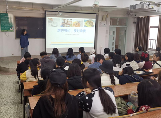 活动开始后,活动负责人播放了“厉行勤俭节约,制止餐饮浪费”的公益宣传片,从深化认识、强化共治、加强监管、注重实效等方面作动员号召;团支书宣读了《关于坚决制止餐饮浪费行为的倡议书》,为“厉行勤俭节约 制止餐饮浪费”表态发言。通过团支书的呼吁,同学们深有感触,纷纷点头表示赞同。“厉行勤俭节约 制止餐饮浪费”的主题贯穿整个活动过程,同学们也深受影响,纷纷表示以后尽自己所能节俭节约。一个国家要想生存和发展,都离不开“勤俭节约”这四个字,每个人都从自己做起,从身边做起,拒绝舌尖上的浪费,牢固树立节约意识。