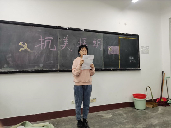活动开始,主持人致开场词,带领同学们回顾抗美援朝这段历史,随后527宿舍全体成员演唱歌由,六人齐声配合,为活动的开场增光添彩。同学们精心准备手势舞《名字叫中国》,在极具感染力的音乐声中,感受祖国的发展壮大,还有同学带来抗美援朝主题的朗诵。同学们相互交流对抗美援朝历史的理解,并表达自己对祖国的热爱与立志报效国家的决心。