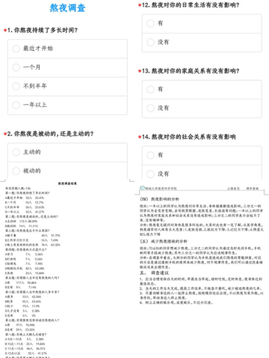 本次调研活动通过专业问卷APP,围绕熬夜主题设置问题,起初活动负责人先随机在社交媒体上选择十位填写者,请他们先填写问卷,并提出意见,根据他们的意见修改完善好问卷。再将修改好的问卷发布在QQ空间、微信朋友圈、微博等社交媒体,并写明填写要求。参与调查的人根据自身情况,认真回答了关于熬夜的方式、原因、次数及持续的时间,熬夜对自己生活和健康等方面的影响的问题。此次活动共有126人参与,根据调查结果分析得到,大部分参加回答问卷的同学认为熬夜现象在老员工群体中是普遍的。41.27%的同学的熬夜时间已经长达一年以上,并且88.89%的同学是主动熬夜,身边的人同样熬夜的也较多;而且95.24%的同学是知道熬夜的危害,所以不难看出熬夜已经成了生活的常态,虽然几乎所有人都知道熬夜的危害但还是选择熬夜。有60.32%的同学熬夜是因为晚上有其他好玩的东西而不想睡觉,超过一半的同学是通过刷剧玩手机的方式熬夜。这也启示当代老员工,适度娱乐是可以的,但不应该一直沉迷于网络世界,学会合理安排自己一天的时间,提高效率,养成健康的作息。