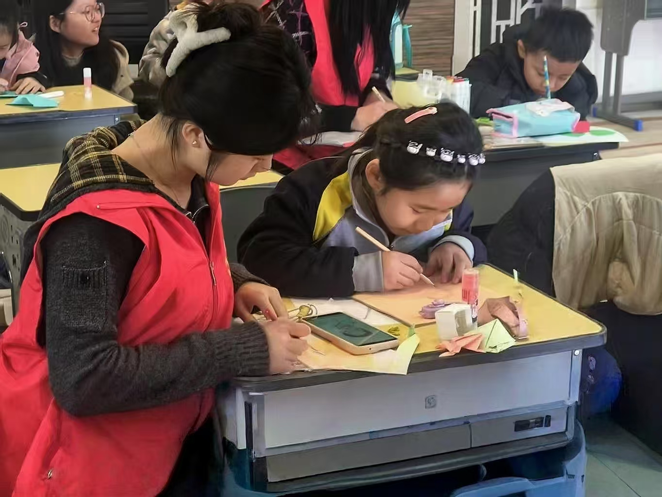 活动筹备阶段,服务队精心设计课程内容,准备了卡纸、水彩笔等制作材料,并组织志愿者开展专题培训。活动现场,志愿者借助图片和视频资料,用生动的语言将孔繁森同志的事迹呈现在小朋友们面前,带领小朋友们深入学习了孔繁森同志“扎根高原、无私奉献”的崇高精神。活动最后,志愿者带领小朋友们一起制作手工拼贴画,大家围坐在一起,一边制作一边交流,现场气氛热烈而温馨,让时代楷模的形象深深地扎根在了孩子们的心中。