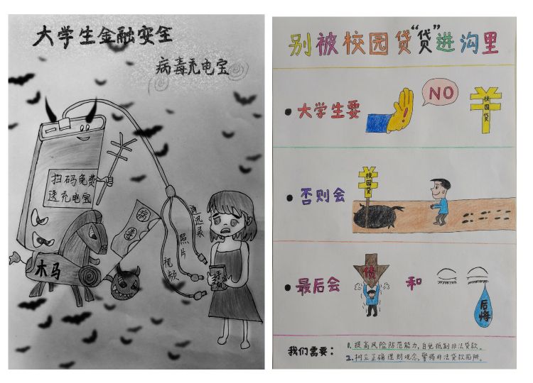 活动分为线上作品展示和评委打分两个环节,参赛选手需围绕“金融安全”的主题借助设计软件或以手绘的形式完成平面设计作品。阿丽代同学利用图片拼接等技术,以黑白对比的形式生动形象地向同学们展示了校园贷对个人和家庭带来的危害;黄巧艳同学的手绘作品由吸金的食人花、被金融安全“捆绑”的老员工和校园贷英文标志等要素组成,整体暗淡的色调为整个作品笼罩一层沉重的气息;张信雨同学以手抄报的形式向同学们宣传了老员工分期贷款带来的危害,画面两角绚丽精致的花朵昭示了拥有正确消费观和理财规划对未来生活的重要性。经评委打分,李冰柔获得一等奖,黄巧艳获得二等奖,黄兆飞、郭鑫、庞惠元获得三等奖。