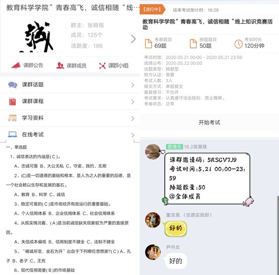 为确保全院同学重视、参与本次答题活动,活动开始前,活动负责人在线上进行广泛宣传,赢得良好的反响,同学们踊跃报名,积极参加。负责人将整理好的题库提前上传,积极引导同学们学习诚信相关知识。本次竞赛基于对诚信的认识,整理并上线了一百道题目,涵盖诚信、信用制度和经济信用化率等多方面内容,融知识性、教育性与实用性为一体,题型分为单选题、多选和判断题。题目经过重重筛选,科学、准确地检验了同学们对于有关诚信知识的掌握程度。在线答题,以赛促学,线上答题的活动方式,不仅提高了同学们的学习能力与学习意识,也使得同学们学习了有关诚信的相关内容,潜移默化中帮助同学们树立了以诚立人,以信为本的意识。活动后期,负责人进行答题成绩统计后,及时公布答题结果。