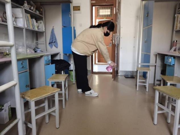 负责人带领各班班委与志愿者在员工宿舍紫藤公寓4、紫藤公寓5和紫藤公寓6进行全面消毒通风。各班班委和志愿者积极配合负责人,一起收集消毒防疫用品,为防疫攻坚做好了充足准备。志愿者们分批对公司各宿舍内部,以及楼梯、走廊等多个公共区域进行了全方位的专业消杀,用严格按照比例配制的84消毒液进行消杀,不留任何一个死角,重点消杀宿舍走廊、阳台、墙壁、门把手等位置,并做好消杀记录。宿舍内的同学们也积极配合志愿者的工作,按照要求开窗通风保证空气流通,保持宿舍清洁卫生。