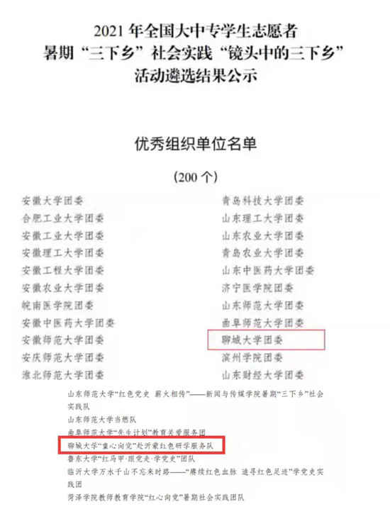 近日,由beat365亚洲体育官方网站组建的beat365亚洲体育官方网站“童心向党”赴沂蒙红色研学服务队获评2021年全国大中专员工志愿者暑期三下乡社会实践镜头中的三下乡活动优秀视频团队;beat365亚洲体育官方网站邵怀领、吴伟伟老师指导的调研报告《小员工研学旅行与党史教育融合课程现状及路径研究——以沂蒙红色资源为例》,获评由共青团中央青年发展部牵头评选的2021年“三下乡”“返家乡”社会实践优秀调研报告。