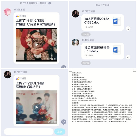活动前期,由活动负责人制定活动规则与活动内容,并将活动要求发送到各班级中,经过班长与团支书的积极宣传,吸引了众多同学报名参加。活动要求同学们制作一份调查问卷,邀请家庭成员参与问答,将调查结果写成调查报告发送到活动群中,为了更加体现“我爱我家”的主题,活动还要求同学们为自己的家庭制作一个小视频。活动举办过程中,同学们积极准备调查问卷,精心制作家庭小视频,同学们上交的作品中无一不展示出同学们对家庭满满的爱。王芳同学将父母年轻时的照片与孩子们的照片剪辑到一起,并在调查报告中阐述道:家庭永远是孩子们的避风港,父母与孩子之间要学着相互体谅、相互理解,一起将家庭生活变得更加幸福。谢安琪同学在调查报告中着重突出了“家庭矛盾的解决办法、家庭的核心”两个问题,并在报告中提到:大多数调查者认为家庭的核心是爱,家庭矛盾解决最好的办法是及时沟通、相互体谅。
