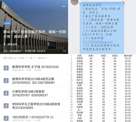 比赛开始之前,主办方下发活动通知并创建活动群。参赛选手及时上交演讲作品,主办方组建评委团,由评委根据演讲时间、演讲内容、语言表达和综合印象四个方面的评分标准对作品进行打分。活动期间,选手们以“匆匆四载东昌府,娓娓一世聊大情”为主题进行演讲,或激昂高亢,或低沉颂吟,声情并茂,用充沛的情感、饱含深情的语调抒发着对毕业季聊大学子的深切祝福。“那时的一切,早就深深印在你我的脑海里,不从忘记。”徐雪苪同学以其引人入胜的演讲内容和深厚的演讲功底赢得了评委的一致赞许。活动后期,主办方负责人安排相关人员统计每组选手得分情况,进行成绩公示。最终,徐雪苪获得第一名,肖柳桐获得第二名,王子强获得第三名。活动负责人对活动进行总结、发放活动积分后,活动结束。