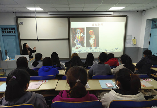 活动开始后,赵雨馨同学通过PPT向同学们介绍戏曲的相关知识,比如戏曲与曲艺的区别、戏曲的不同剧种及其关系、戏曲行当分类、脸谱与人物性格的关系等,激发了同学们浓厚的学习兴趣。接着赵雨馨以中国影响最大的剧种——京剧为主,为同学们介绍了京剧旦角四大流派。结合着PPT上对京剧旦角四大流派创始人、代表作的介绍,赵雨馨分别以四大流派某一代表作的片段为例向同学们示范各个流派的不同唱腔,婉转优美的唱腔生动地刻画出人物的精神世界,同时赵雨馨还阐述了四个流派不同的特点和风格。在随后的互动环节中,同学们跟着赵雨馨学习京剧的唱腔发音,整个过程精彩纷呈,欢笑不断,其乐融融。赵雨馨向同学们展示和介绍戏曲服饰后,活动负责人组织同学们有序退场,活动圆满结束。