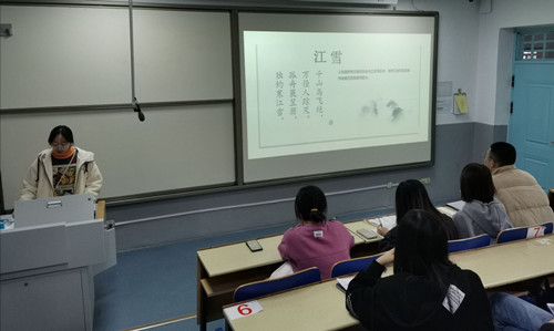 诗词笔下深意,文字唇边留情。大赛伊始,会议组织者发放了诗词接龙比赛试题,参赛者信心满满,奋笔疾书,将诗词一一默过。在诗词抢答环节,随着PPT上问题的显示,参赛选手纷纷踊跃举手,气氛剑拔弩张,每一个问题都得到了有力而准确的回答,每一位参赛者都积极参与,比分在一个个正确的回答之中不断累积,选手们深厚的古诗词素养展露无遗。在主观素养考察阶段中,选手们踊跃表达自己对诗词的理解,对优秀而隽永的诗词进行赏析,修辞手法巧妙绝伦、描写方式独树一帜、读者情感深刻悠远等观点令观众们受益匪浅。参赛者对古诗词的掌握与表达令人惊叹,妙语连珠的赏析也得到了评委们的阵阵喝彩,更赢得了观众们热烈的掌声。活动最后,经过公平公正地统计,赵冰获得一等奖,张颖慧和吕淼淼获得比赛二等奖,张凯悦、张雪同学、李浩然和张莹获得比赛三等奖。