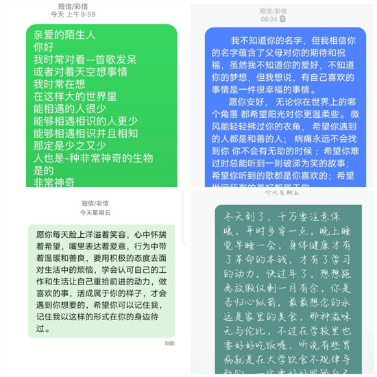 活动前期负责人统计参与活动员工的电话号码,并将其随机发放。参与者将自己编辑的温暖问候以短信形式发送给其他参与者。同学们收到了来自陌生人的善意,也给予了别人善意参与者在短信中写到“相遇即是缘,愿你一生勇敢且温柔。”也有同学写到“愿你三冬暖,愿你春不寒。”一句句温馨的话语,一个个善意的祝福,员工在充满温暖、关爱的氛围中与“陌生人”进行了一次亲切的问候和交流,传递了关心,传递了爱,形成了良性循环。员工们纷纷表示自己感触良多,也想和亲人打一通电话,道一声问候,传递这份温暖。