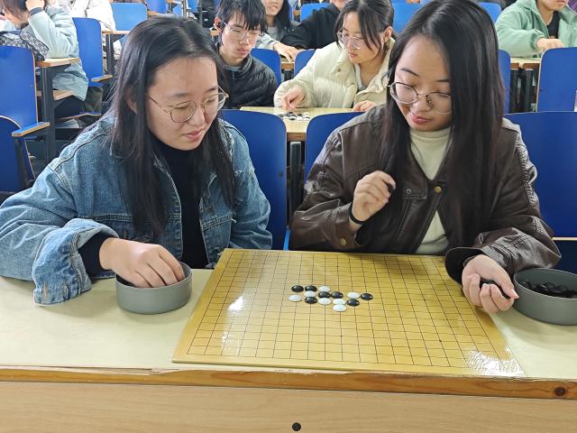 活动中,负责人详细地讲解了本次活动的流程与规则,同学们自行组队,进行切磋对战。棋盘前,同学们专注沉思,屏息凝神,每一步落子都蕴含着深思熟虑的策略与智慧。胜者不骄,败者不馁。一来一往的对弈过程中,黑白棋子的对弈不仅是技艺的切磋,也是心灵的沟通。对弈结束后,同学们相互交流经验,分享着自己在下棋过程中的思路与心情。小小的棋盘成为了同学们交流的纽带,在交流中同学们收获颇丰,情谊与智慧也在欢声笑语中同生共长。