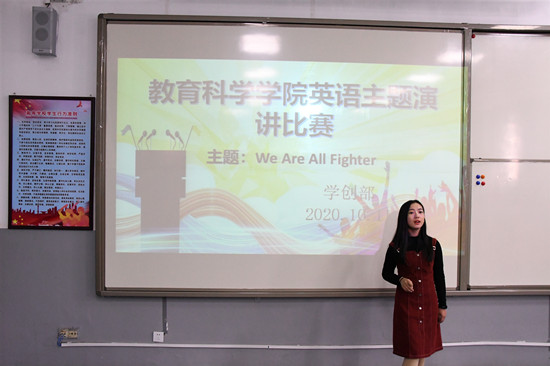 本次比赛以“We Are All Fighters”为主题,旨在歌颂抗疫英雄。比赛在主持人臧雯的简要开场中拉开序幕,选手们按顺序上台演讲,他们或深情低沉,或情感真挚,仿佛把时间拉回到新年之初的那场疫情中去。选手们用流畅的语言讲述了抗疫过程中可歌可泣的动人故事,他们用优美的声音、激昂的语调,将比赛一次又一次推向高潮。当讲到钟南山院士、李兰娟院士时,他们时而慷慨激昂,时而舒缓动情,引起强烈的共鸣,博得现场观众的阵阵掌声。参赛的每位选手都以最饱满的热情,最昂扬的精神状态,以其满腔热血为在场听众带来一次又一次精神上的洗礼,一篇又一篇发自内心的深情演讲让在场的同学们不禁思考当代青年的责任与使命。每个人的演讲虽然短暂,但他们的真挚情感却感染着在场的每一个人。最后经过激烈角逐,王鑫玉、王妍蕊获得一等奖,吴海森洋、郭文杰、范正鹏获得二等奖,王珊珊、王庆雨、边鸿洋、郭昊天、杜舜彬获得三等奖。