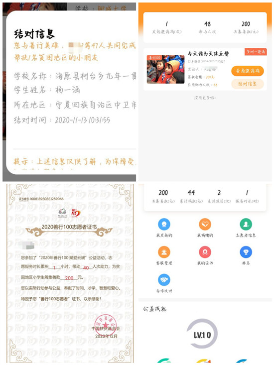 活动伊始,参与活动的志愿者通过扫描微信二维码或微信搜索“善行100”进入小程序,进行志愿者注册。注册完成后,志愿者在自己的各种社交平台上介绍、传播“爱心包裹”项目,邀请爱心人士助力。每一次发起邀请捐存在7天有效期,到期将自动关闭。募捐过程中,志愿者详细地讲解活动的意义和爱心包裹样品,凭借动人的言语打动爱心人士,即使募捐过程中存在着拒绝、无视与误解,也不轻言放弃,坚信付出总有回报。200元募捐目标达成后,中国扶贫基金会将统一派善行英雄会为贫困地区小员工送去温暖包裹。同时志愿者在完成相应善款任务和志愿服务时长后,可获得纸质版志愿者荣誉证书。谢安琪、王悦、罗嘉嘉等同学获得荣誉证书。