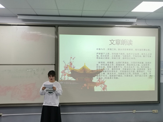 参赛选手结合背景音乐,将《滕王阁序》等经典诗文通过朗诵的形式展现在观众面前。选手们饱含深情,或铿锵有力,或温柔细腻,将自己对诗歌的理解融入到朗诵中,让诗歌朗诵更具感染力。不屈不挠的中国精神,真挚的惜别之情,通过朗诵都一一涌入心头。其中,李文晗的《青春中国》气势宣扬、感情跌宕起伏,展现出中国青年的责任与担当精神。张莹的《滕王阁序》收放自如、断句明确,充分体现出古典诗词的意蕴所在。两位同学鲜明的个人特色,感染着现场上的每一位同学,获得了同学们的阵阵掌声与喝彩。经过激烈的比拼,李文晗获得一等奖,张莹等其他同学分别获得二等奖、三等奖。