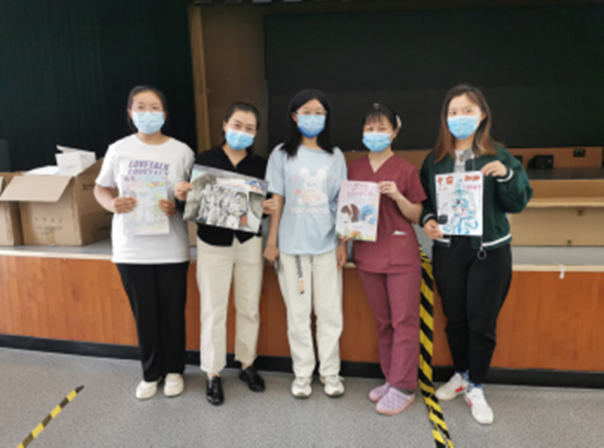 参赛者们围绕“天使展翅,爱满人间”这个主题画出自己心中最美的医护工作者工作的样子,并为他们献上祝福语。参赛者们自己动手,通过绘画、书写等形式制作了一张张承载着感激之情的画报,用艺术的形式表达对医护人员的感激与敬佩。李京霖画出了医护人员的背影和正面,写上了“愿你披荆斩棘 归来仍是少年”的祝福,张明哲画出了医护志愿者奔赴疫情一线下飞机时的场景,重重身影像城墙,保护着身后的人民。活动负责人收集后将作品送给每日为师生做核酸的医护工作者,代表参赛者们送上节日祝福。坚守岗位的工作者们收到同学们的礼物表示非常开心和欣慰,他们拿着作品与活动负责人拍照留念,并表示会为救护工作而奋斗终生。自疫情暴发以来,护士为打赢疫情防控阻击战、保障各国人民生命安全和身体健康作出重要贡献。护理战线上的“白衣天使”以较强的事业心和高度的责任感,把真诚的爱无私奉献给了每一位患者。