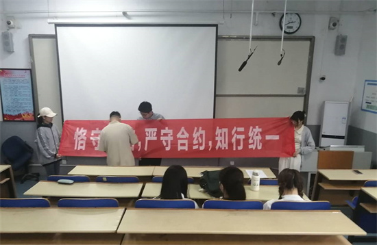 活动开始前,主持人讲述诚信的意义。随着活动的进行,同学们将自己的名字一笔一划地书写在印有“恪守诚信 严守合约 知行统一”的条幅上。通过签名每位员工表达了自己坚守诚信的决心和毅力,并表示今后要不断提升道德素养,为营造和谐美丽的校园环境贡献力量。活动现场,资助服务部志愿者们向参与的同学进行诚信知识的普及及国家助学贷款等国家资助政策的宣传,帮助同学们进一步了解国家政策。