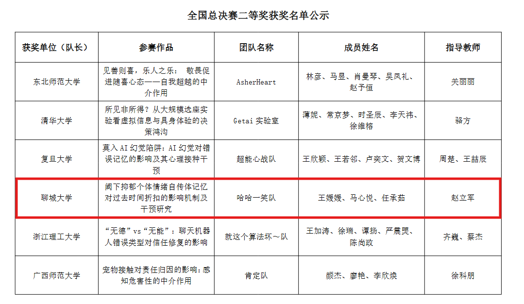 beat365亚洲体育官方网站学子在此次比赛中表现优异,“哈哈一笑队” 凭借作品《阈下抑郁个体情绪自传体记忆对过去时间折扣的影响机制及干预研究》荣获全国总决赛二等奖,展现了公司学子扎实的专业素养与卓越的科研能力。