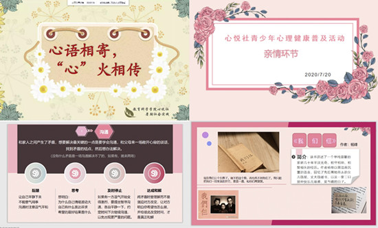 活动在音乐中准时开始,活动负责人将活动环节按照所要讲解的问题种类分为了亲情、学习和人生发展三部分。每一部分心悦社成员都安排了演讲和幻灯片演示,让青少年对问题的了解更深入的同时,也指导着他们如何解决问题、对待学习、规划人生。在演讲展示完毕后,活动进入了问答环节,同学们既可以线上语音提问,也可以在群里匿名提问,将互动性和可选择性发挥到了极致。对于提出的问题,心悦社成员积极回答,并与孩子们深入探讨,在此期间也有孩子们的家长加入,让整个环节进入了白热化。活动后期,活动负责人对活动进行总结,活动圆满结束。
