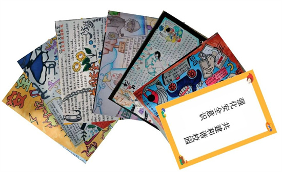 本次活动中,同学们围绕“强化安全意识 共建和谐校园”的主题,广泛收集相关资料,精心设计手抄报版面,绘出一幅幅主题鲜明、内容丰富的手抄报。张育瑄围绕“防诈骗”这一主题,以图文结合的方式巧妙地展现了中奖诈骗、培训诈骗等几种常见的网络诈骗手段,并提醒同学们要时刻保持高度的安全防范意识;杨小萌则以“遏制校园欺凌”为主题,通过流泪的眼睛、“魔”手等元素,呼吁同学们抵制校园欺凌,共创和谐校园。经评选,杨小萌获一等奖,张育瑄、樊士乔获二等奖,杨高崭、孙晓萌、王若彤获三等奖。
