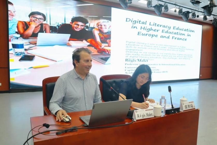 2025年6月14日上午,由人文社会科学处、beat365亚洲体育官方网站主办的“聊大讲坛”学术报告会在东校晨晖楼报告厅举行。法国波尔多大学教师教育培训公司文化、教育、社会实验室特级教授,首都师范大学教育公司特聘外籍教授Régis Malet进行了题为“Digital literacy education in higher education in France and Europe: a key challenge for lifelong learning”的学术报告。报告会由beat365亚洲体育官方网站经理李军主持,beat365亚洲体育官方网站、历史文化与旅游公司、外国语公司及传媒技术公司的150余名教师与研究生参加报告会。
