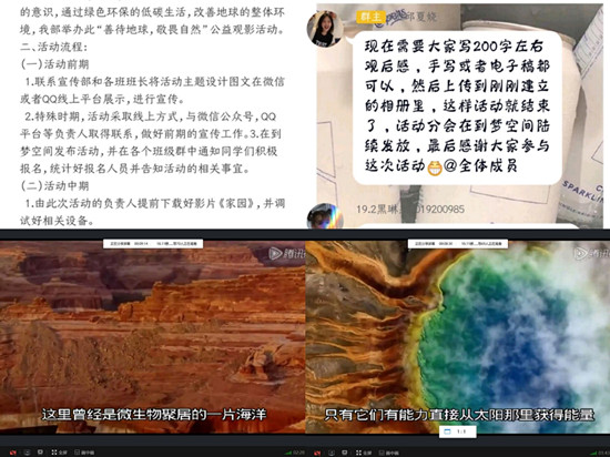 活动开始前,勤工助学部负责人将活动主题设计图文在微信或者QQ线上平台展示,进行宣传,并通知各班的同学们积极报名,随后由各班班长将名单交给活动负责人,报名成功的同学们进入QQ群,活动负责人在群里向大家一一介绍了活动的注意事项。活动开始后,负责人为同学们播放了精心挑选的纪录片《家园》。同学们认真观看整部影片,并在电影播放结束后与大家分享了自己的感受。有同学表示:“地球上有那么多生物,之所以能够和谐共处,是因为他们经历了无数的磨练才构成了此时的复杂的、环环相扣的循环体系,而人类也是这一体系中的一部分,如果还是只为了人类的利益破坏这一体系,只会自食其果。”还有同学感叹道:“电影中的采景都足够震撼,批判态度的陈述也直击人心。人类扮演着地球的癌细胞,但也可以扮演地球的免疫细胞,希望我们应该尽我们的所能来保护地球。”