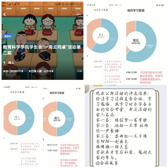 活动前期,由活动负责人制定活动规则与活动内容,并将活动要求发送到班级群中,经过班长与团支书的宣传,活动吸引了众多同学报名参加。活动要求同学们在规定的软件上每天按时打卡学习,并将打卡学习的照片发送到活动群中,虽然是在家中学习,但是同学们仍然认真对待,有同学学习英语四级词汇,并将做题的记录发送到活动群中,与大家一块探讨学习,还有同学将上网课的笔记与同学们分享,并将上网课中发现的疑难问题发送给学习搭档,同学之间相互探讨解决,还有同学分享课外阅读的书籍,与学习搭档一起交流阅读感悟,增加知识储备。活动最后经过学习过程、学习感悟、学习时长等方面的综合考量,陈筱雪、葛常静同学为第一名,池钰、王翠、杜雨欣、尹素梅同学为第二名。