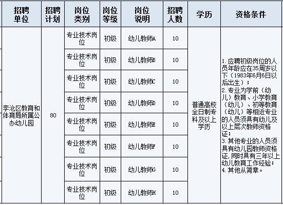 根据《事业单位人事管理条例》(国务院令第652号)和《事业单位公开招聘人员暂行规定》(原人事部令第6号)、《青岛市事业单位公开招聘工作规程(试行)》(青人社发〔2017〕3号)、《关于事业单位公开招聘试行多元化办法的通知》(青人社字〔2014〕19号)、《关于做好2019年度事业单位公开招聘工作的通知》(青人社办字〔2019〕19号)、《山东省实行人员控制总量备案管理的事业单位人事管理办法(试行)》(鲁人社发〔2017〕53号)和《山东省人民政府办公厅关于加快学前教育改革发展的意见》(鲁政办字〔2018〕71号)等文件精神以及国家、省、市有关规定和要求,李沧区教育系统2019年拟面向社会招聘控制总量备案管理幼儿园教师80名。现将有关事项公告如下: